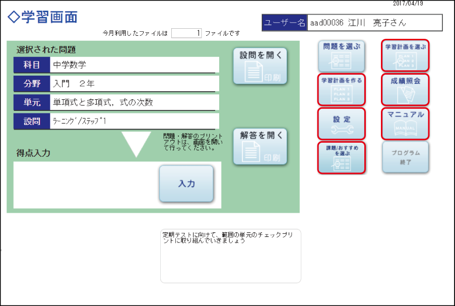 『開いて決定』ボタン「判定結果」・「問題を選ぶ」・「学習計画を選ぶ」・「課題/おすすめを選ぶ」画面に表示されます。