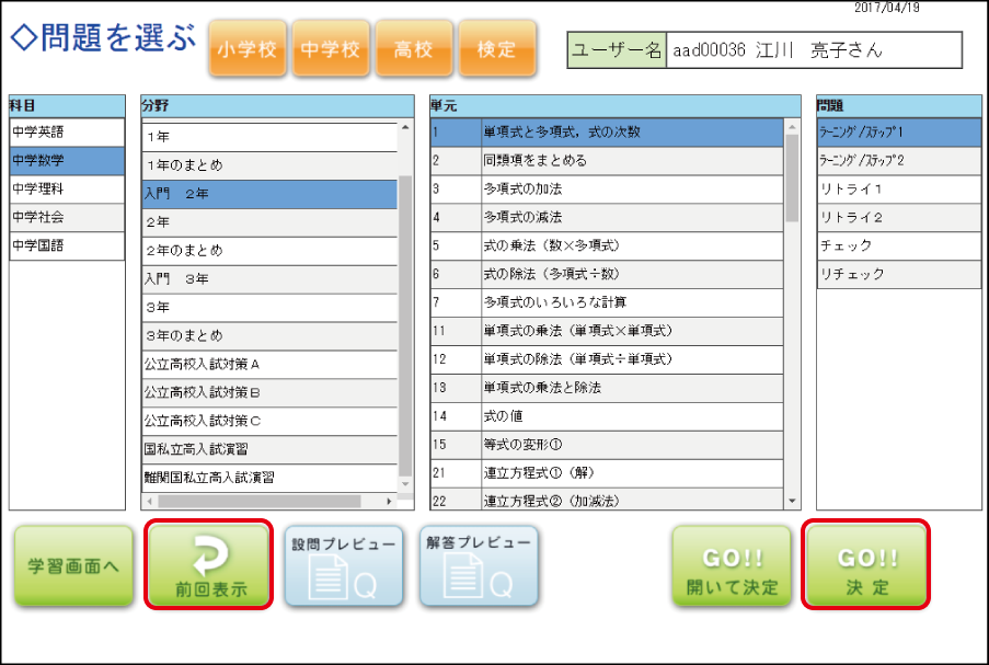 『前回表示』ボタン 選択中の科目で、前回学習した問題を表示します。